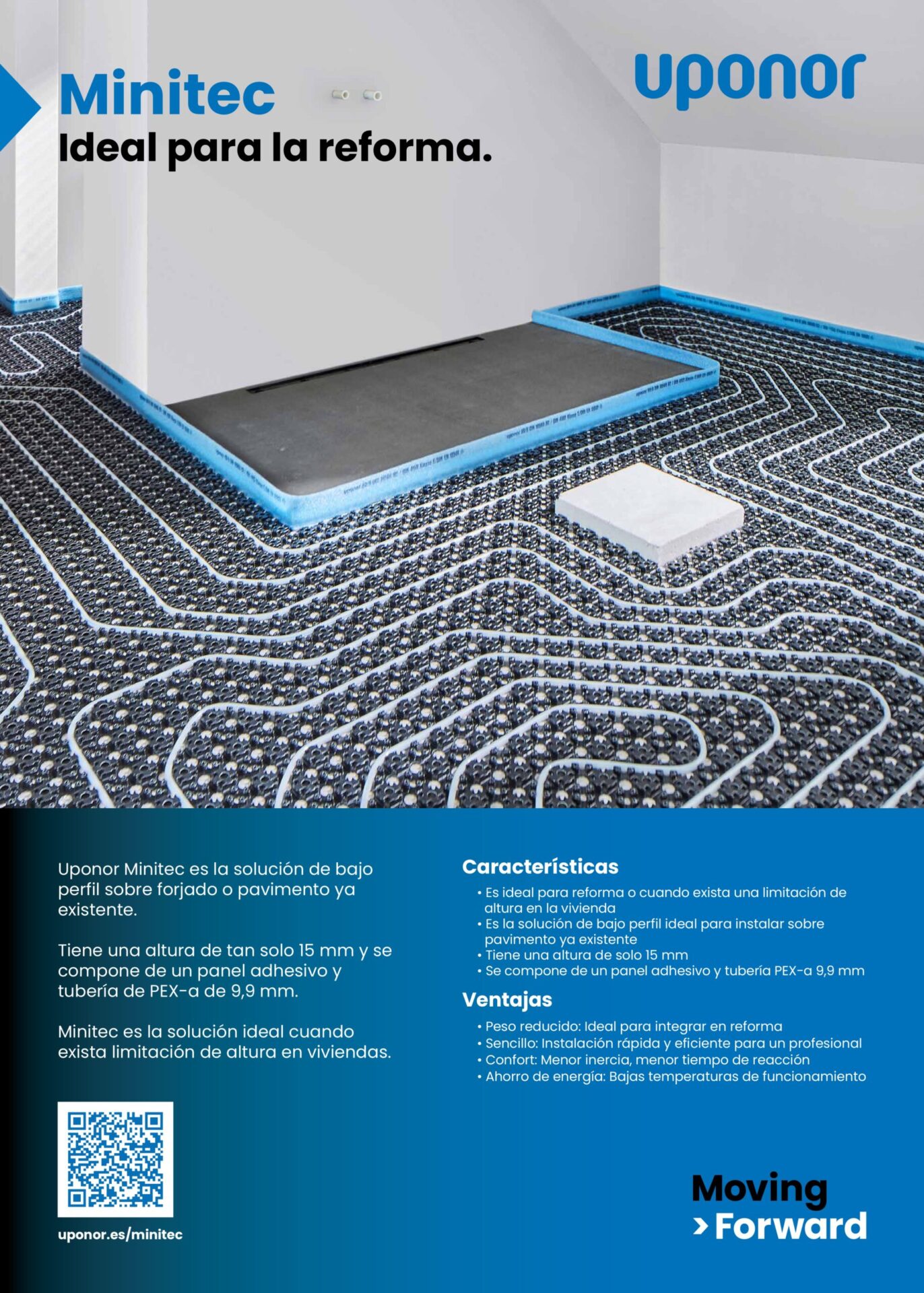 Este producto es una gran solución para uso sobre forjado o pavimento que ya existe. Una de sus principales ventajas es su reducido grosor, tan solo 15 mm componen este producto donde se combina un panel adhesivo y una tubería de Pex-a de unos 9.9 mm.
