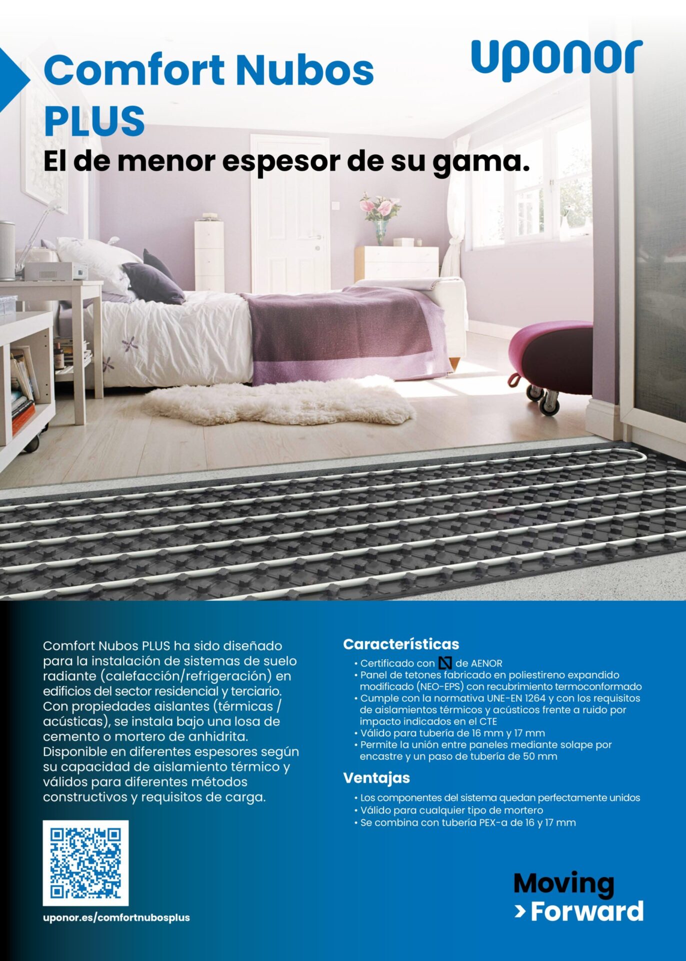 Si la anterior instalación poseía un grosor mínimo, este modelo cuenta con el menor espesor de su gama. Este modelo de suelo radiante ha sido diseñado para ser usado en edificios residenciales para el uso como calefacción y refrigeración. Además, también posee una función de aislante acústico. Para su instalación debemos de tener en cuenta de que se debe colocar debajo de una losa de cemento o mertero de anhidrita.
