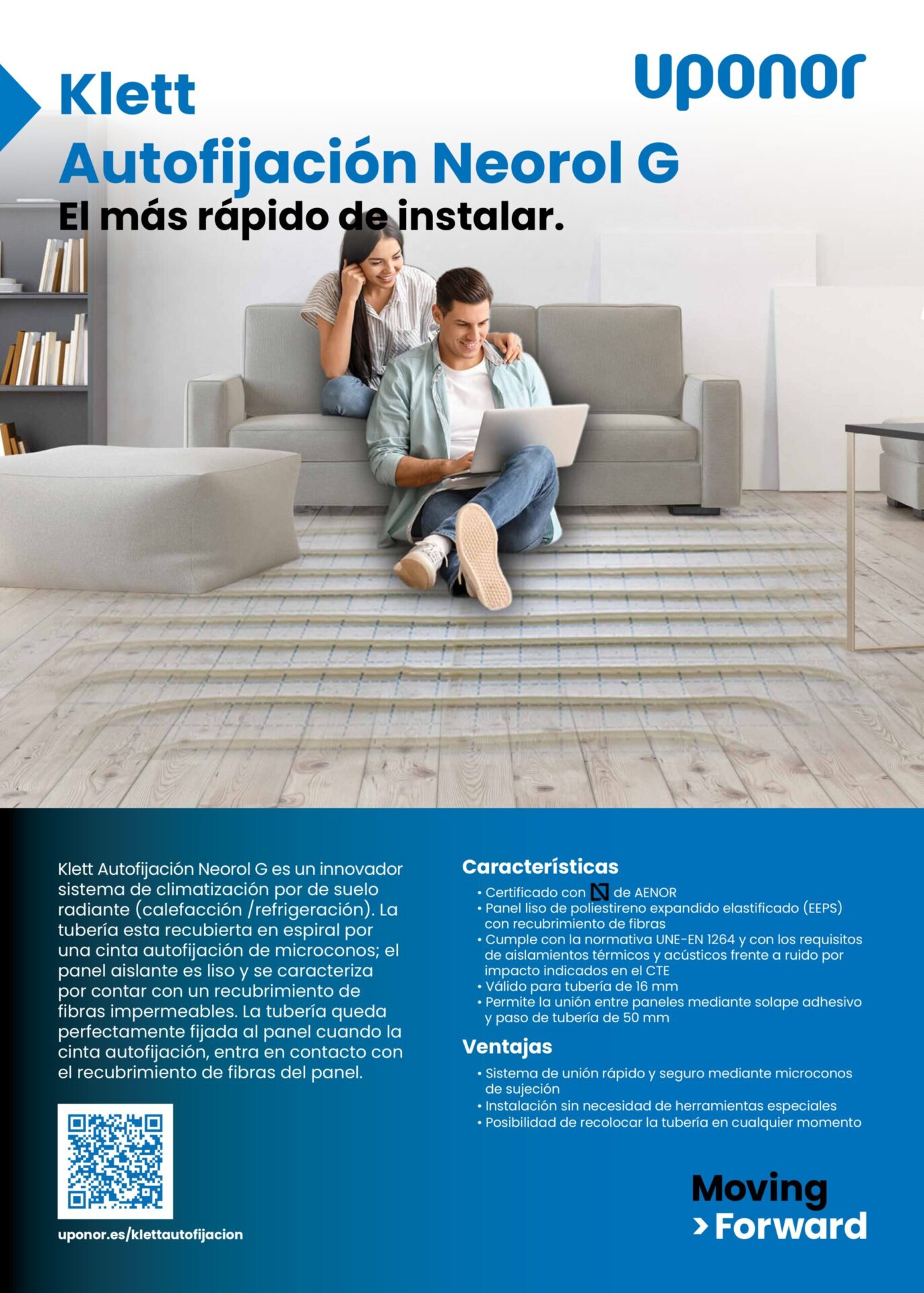 Klett Autofijación Neorol G, es un sistema de climatización de suelo radiante. La tubería está recubierta en espiral por una cinta de autofijación de microconos. El panel aislante es liso y cuenta con un recubrimiento de fibras impermeables. La cinta se fija perfectamente al entrar en contacto con las fibras del panel. Por todas estas razones, este modelo es el más rápido de instalar. Además, dicha instalación se producirá sin necesidad de herramientas especiales y con la posibilidad de recolocar las tuberías en cualquier momento.
