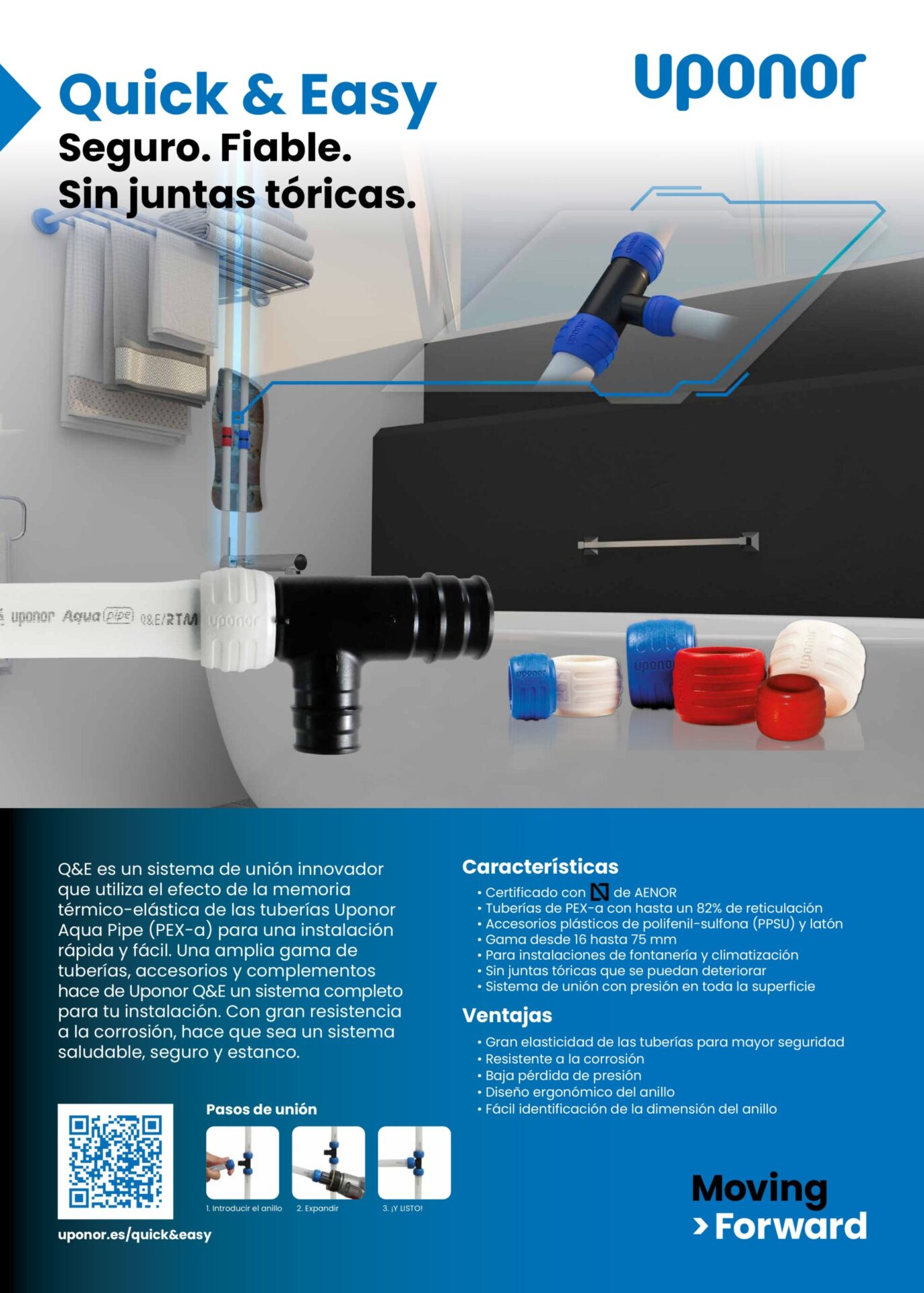Q&E es un sistema que hace uso del efecto de la memoria térmico-elástica de las tuberías Aqua Pipe para una instalación sencilla. Existe una amplia gama de accesorios y complementos para hacer de este sistema uno muy completo para la instalación. Además, otra ventaja del modelo es su gran resistencia a la corrosión haciendo de este modelo un sistema muy seguro. Entre las ventajas del modelo se encuentran también su resistencia a la corrosión, la baja pérdida de presión o el diseño ergonómico del anillo. Además, sus tuberías cuentan con una gran elasticidad para garantizar una mayor seguridad.