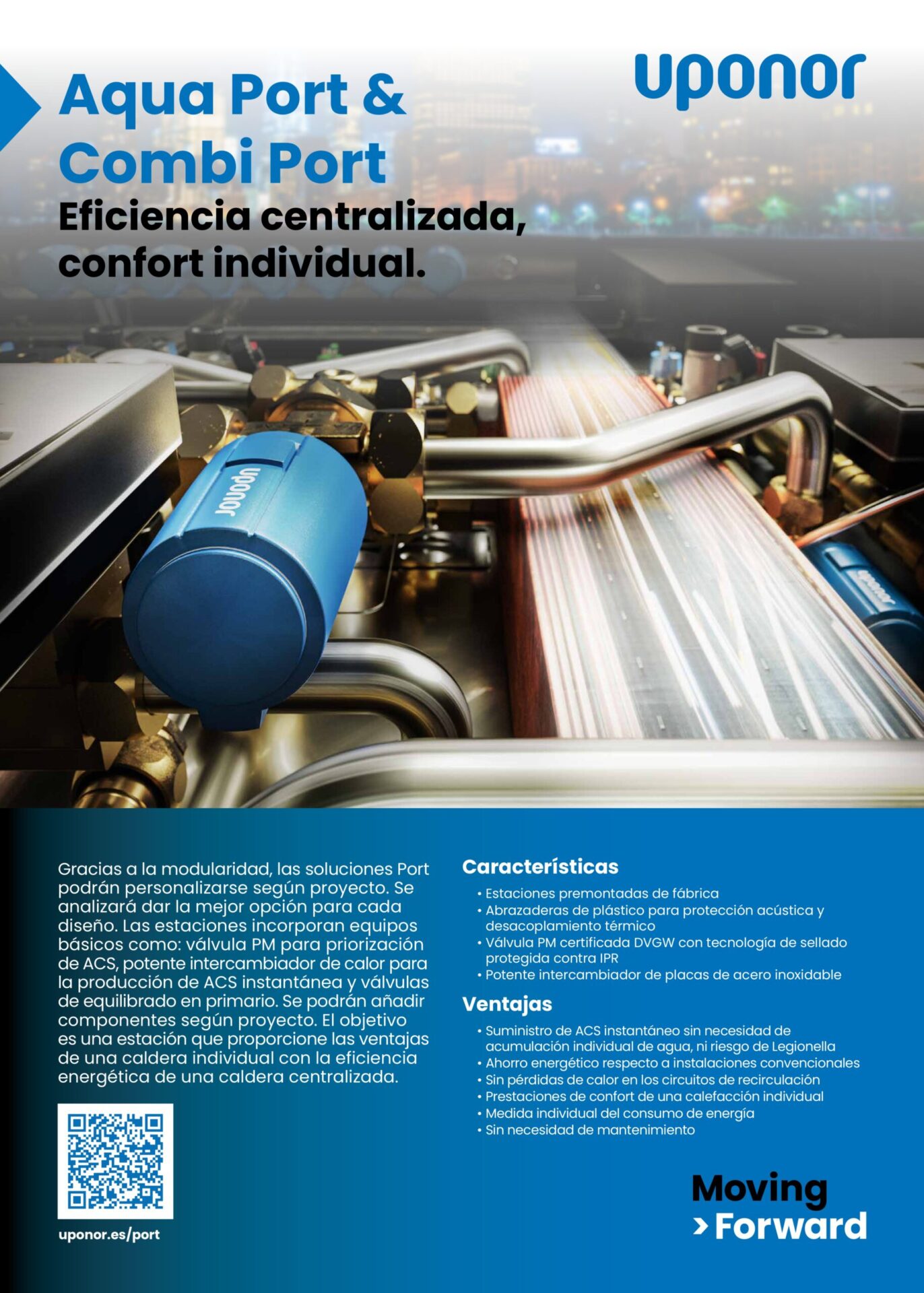 Las estaciones Port podrán personalizarse en función a las necesidades de los propios espacios de los consumidores. Estas estaciones incorporan equipos básico como pueden ser las válvulas PM y válvulas de equilibrado en primario. Este modelo permitirá la incorporación de componentes según proyecto. De esta manera, se busca conseguir las ventajas de una caldera individual con la eficiencia de una caldera centralizada.